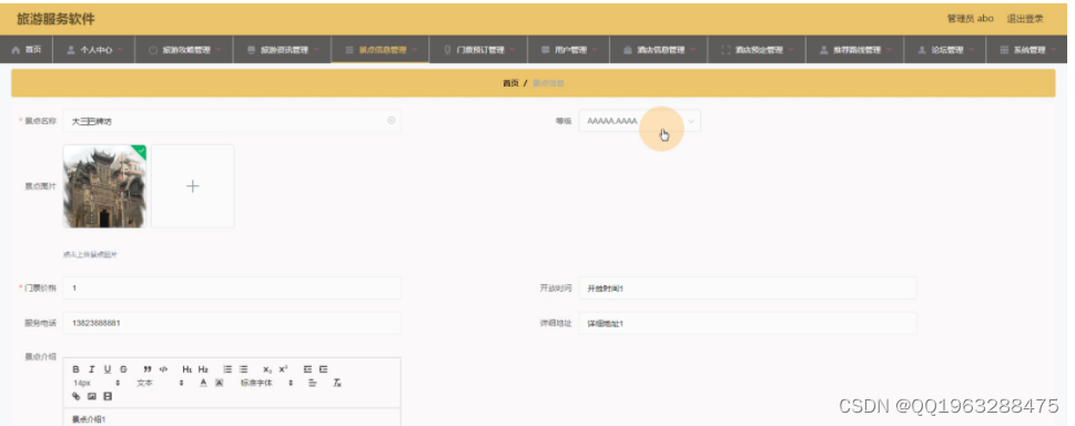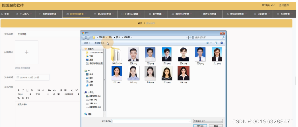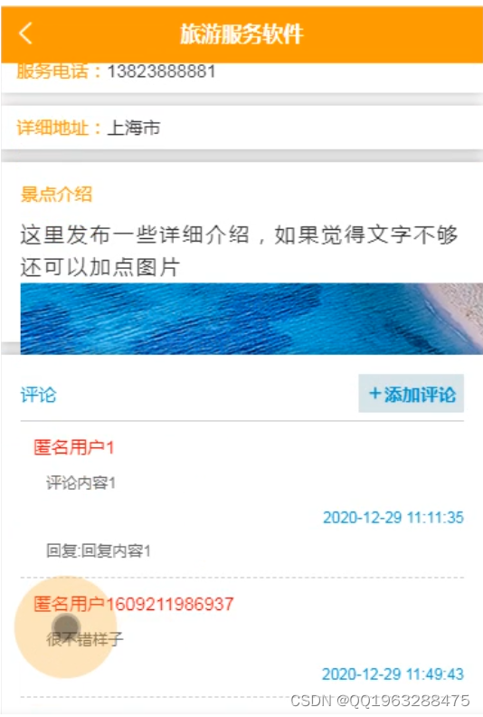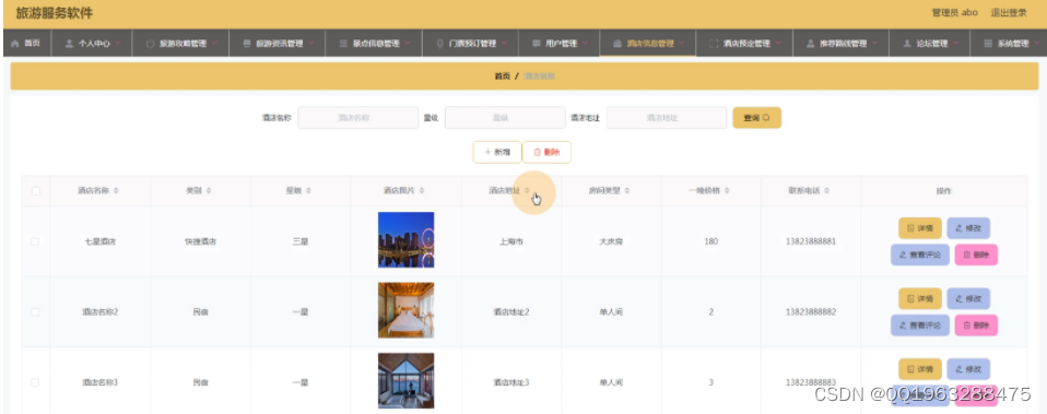 本旅游服务软件,主要实现了管理员后端:首页、个人中心、旅游攻略管理、旅游资讯管理、景点信息管理、门票预定管理、用户管理、酒店信息管理、酒店预定管理、推荐路线管理、论坛管理、系统管理,用户前端:首页、景点信息、酒店信息、论坛中心、我的等。总体设计主要包括系统功能设计、该系统里充分综合应用Mysql数据库、JAVA等相关知识。网页界面的构成,具备简单易懂、便捷等特征。设计过程中,第一,静态页面的制作需要应用语言,以及APP的美工,在这些方面均收获了较好的成绩。第二,针对HBuilder X等技术动态编程以及数据库进行努力学习和大量实践,并运用到了APP的建设中。