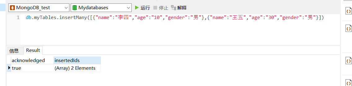 document:document or array 要插入到集合中的文档或文档数组(json格式)