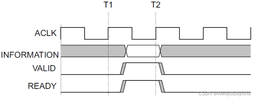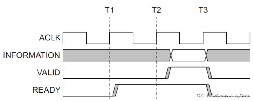使用VALID和READY信号作为控制信号来传输数据,只有VALID与READY同时为高的时候,才可以正常的发送数据,而通常情况下,VALID信号用来表示什么时候 主设备 “地址、数据、和控制信号”是有效的,而READY信号则用来表示什么时候 从设备 准备好采集数据了。