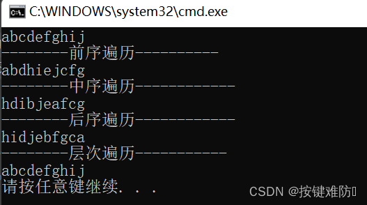 {LinkQueue Q;//创建辅助队列头尾指针InitQueue(Q);//初始化头尾指针BiTree pnew;//用来指向新申请的树结点的指针BiTree tree = NULL;//树根的指针BiTree de;//char c;//输入内容为 abcdefghijwhile (scanf("%c", &c)){if (c == '\n'){break;}pnew = (BiTree)calloc(1, sizeof(BiTNode));//calloc申请空间并对空间进行初始化,赋值为0pnew->data = c;//数据放进去EnQueue(Q, pnew);//将新创建的树的结点的地址入队辅助队列//下面是建树的过程if (NULL == tree)//空树{tree = pnew; //tree指向树的根节点continue;//该节点为树的第一个节点//直接跳到循环的判断部分}else {if (NULL == Q.front->next->p->lchild)//如何把新结点放入树{//Q.front->next为辅助队列第一个结点Q.front->next->p->lchild = pnew;//把新结点放到要插入结点的左边}else if (NULL == Q.front->next->p->rchild){Q.front->next->p->rchild = pnew;//把新结点放到要插入结点的右边DeQueueF(Q);//左右都放了结点后,辅助队列该删除第一个节点了//该函数只用于出队,不保存出队结点的数据}}}printf("--------前序遍历----------\n");//也叫先序遍历,先打印当前结点,打印左孩子,打印右孩子PreOrder(tree);printf("\n--------中序遍历------------\n");//先打印左孩子,打印父亲,打印右孩子InOrder(tree);printf("\n--------后序遍历------------\n");//先打印左孩子,打印右孩子,最后打印父亲PostOrder(tree);printf("\n--------层次遍历-----------\n");LevelOrder(tree);printf("\n");return 0;