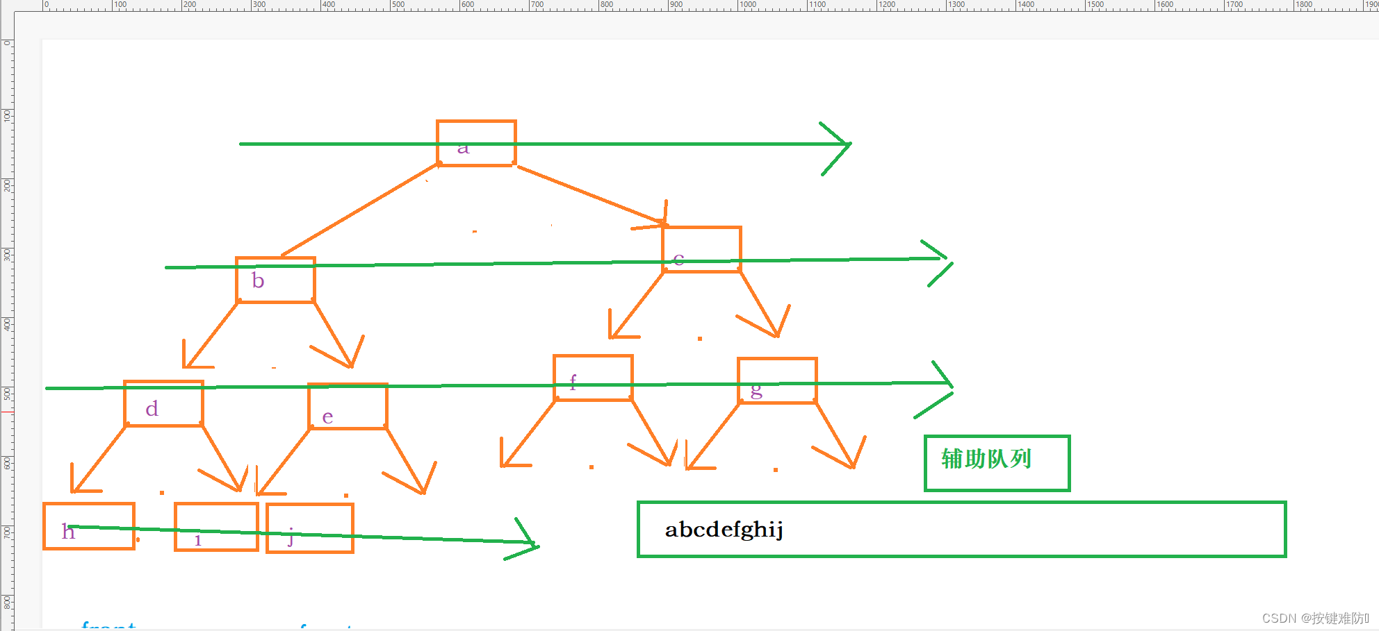 树根的地址作为辅助队列的第一个结点的数据域,然后删除第一个结点,保留数据域,然后借助树根的地址让自己的左孩子(b)和右孩子(c)分别入队,然后打印左孩子数据域(b),再入队左孩子的两个分支(de),然后打印右孩子的数据域,入队右孩子的两个分支(fg),然后一直这样循环。就可以把树连根拔起。