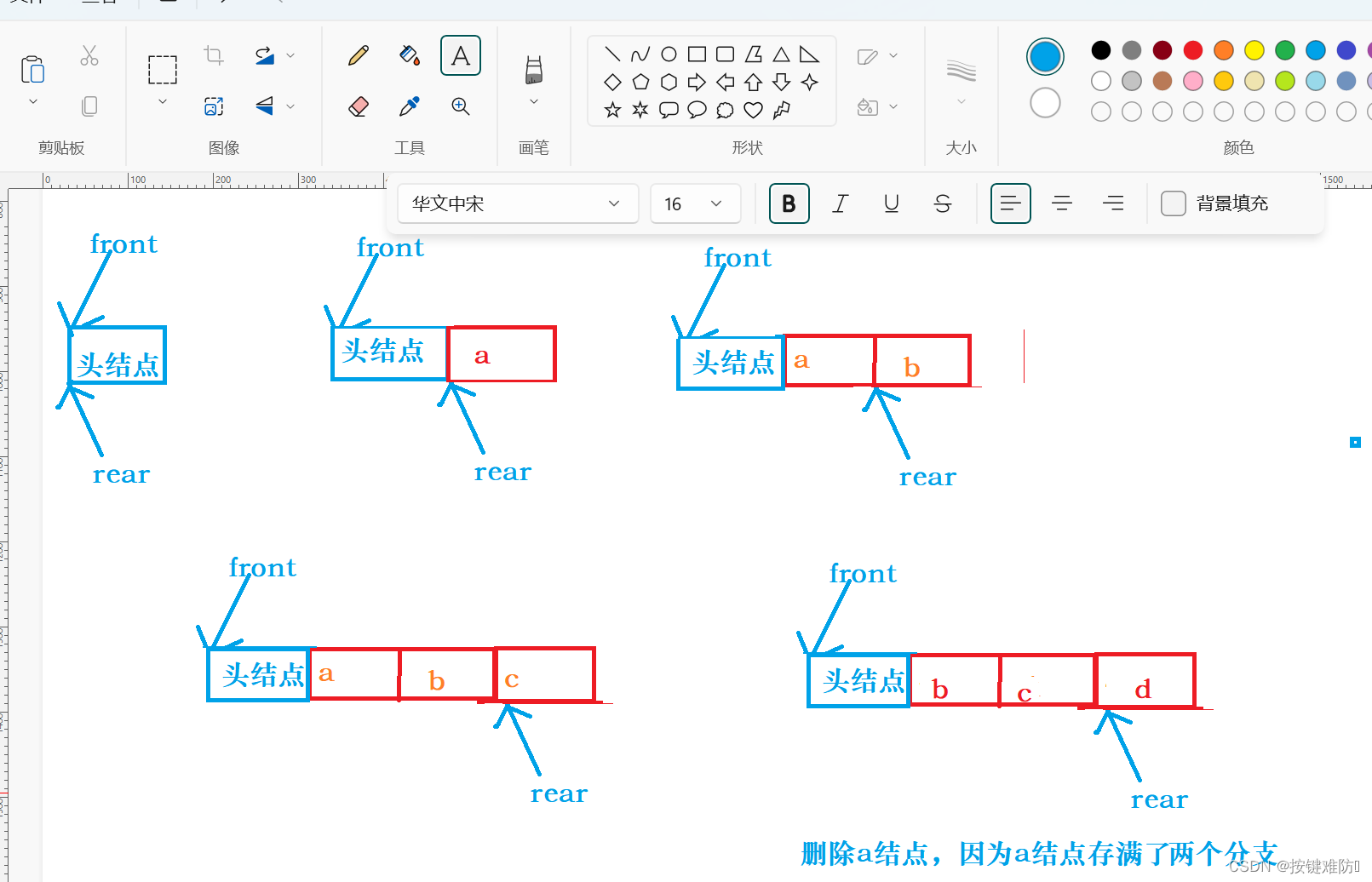 {//不保存删除结点数据域//front始终指向头结点,但头结点什么都没存LinkNode *q = Q.front->next;//将第一个节点存入qQ.front->next = q->next;//断链,保留第一个结点的指针域,让头节点指向第二个结点free(q);return true;