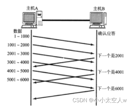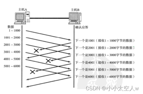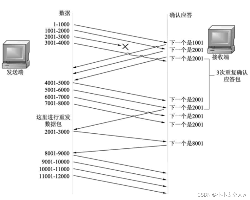 如果2001 - 3000的数据丢了,后面的ack都是2001。直到数据发送到7001 - 8000返回的ack也是2001(索要2001的数据)。这时候主机A发现丢包了,将2001 - 3000的数据包重新传一下,然后返回的ack就是8001(最新的索要序号)。就证明前面的数据发送完成。