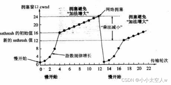 开始是指数增长,当窗口达到一定大小就变为线性增长。当传输过程一旦丢包了(网络拥塞),说明窗口大小已经是极限了。此时就把窗口大小一下缩小为很小的值(重复刚才的指数增长和线性增长)。