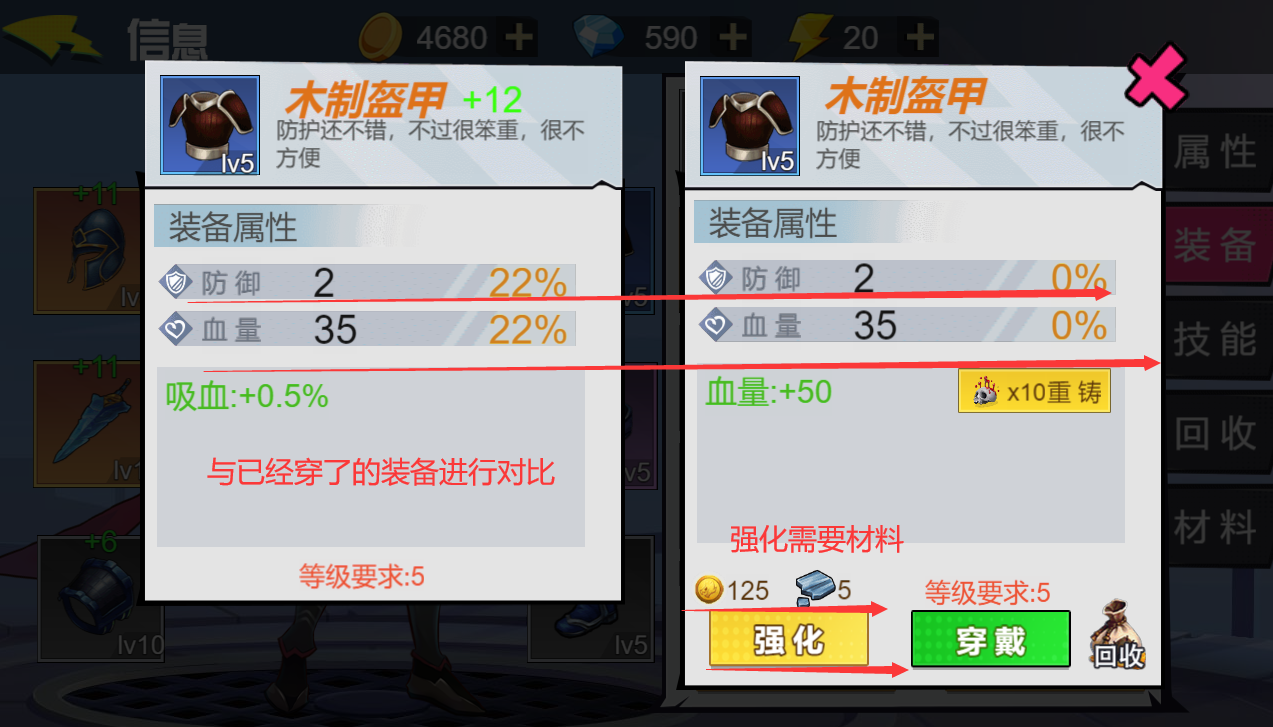 “装备穿戴升级”:升级装备的防御力攻击力等,同时可以穿戴设备,如图2-11所示: