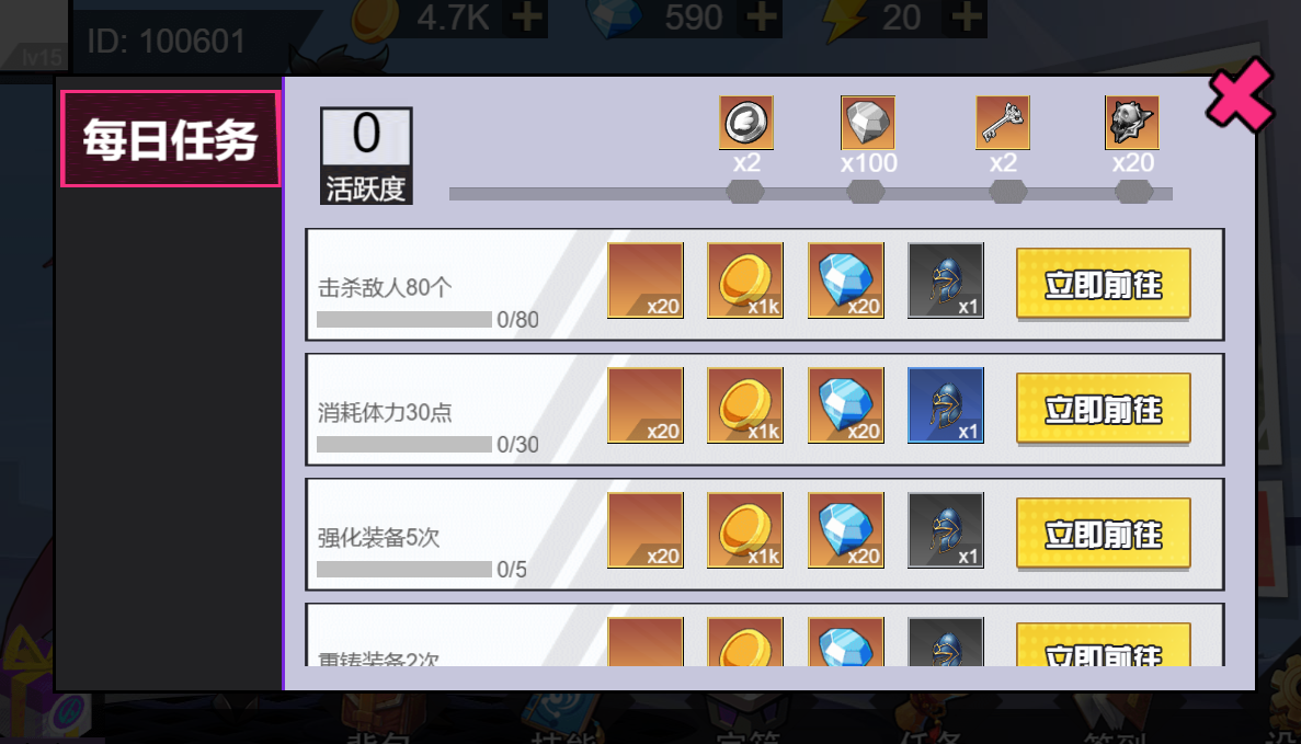 “任务系统”是玩家通过领取任务完成对应的任务,获得升级或奖励,也是游戏开发种很重要的一种玩法,如图2-4所示: