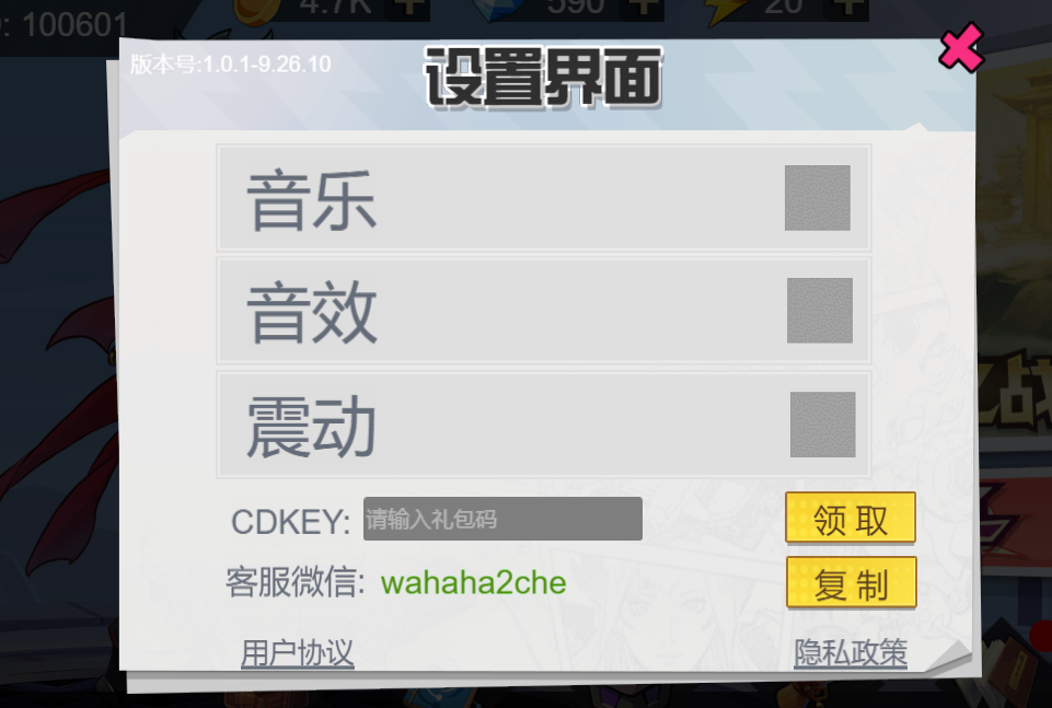 先来看”设置”, 设置功能主要是包含: 是否开启音乐,音效,震动。留下支付的微信客服,如果后续要购买游戏内的物品,可以直接加客服微信游戏外完成购买支付,以及隐私政策等。如图: 2-2所示
