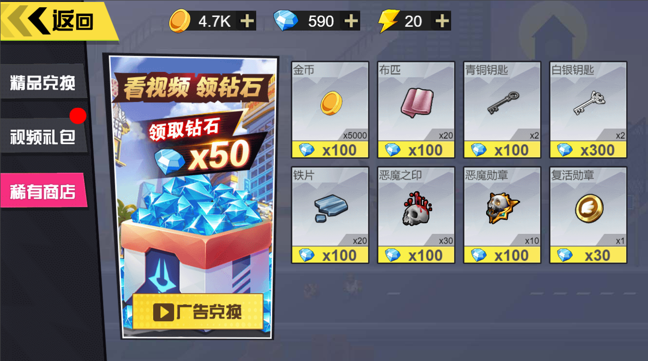 “商城”引入钻石系统,通过钻石来购买对应的装备和物品,通过光看广告或者给客服充值来获得更多的钻石礼包,如图2.6所示: