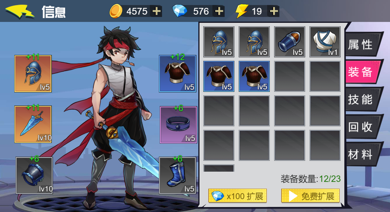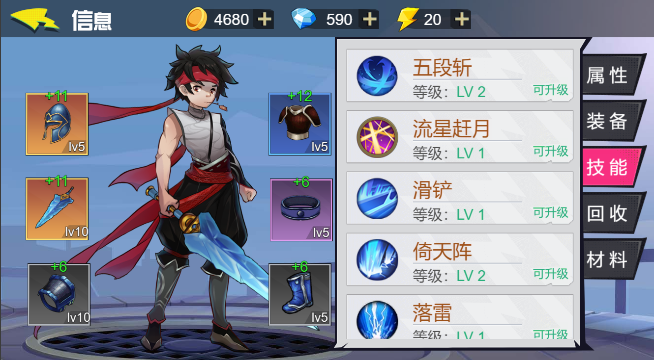 “材料”,列举出来你当前有的材料,给装备加固升级的时候使用。