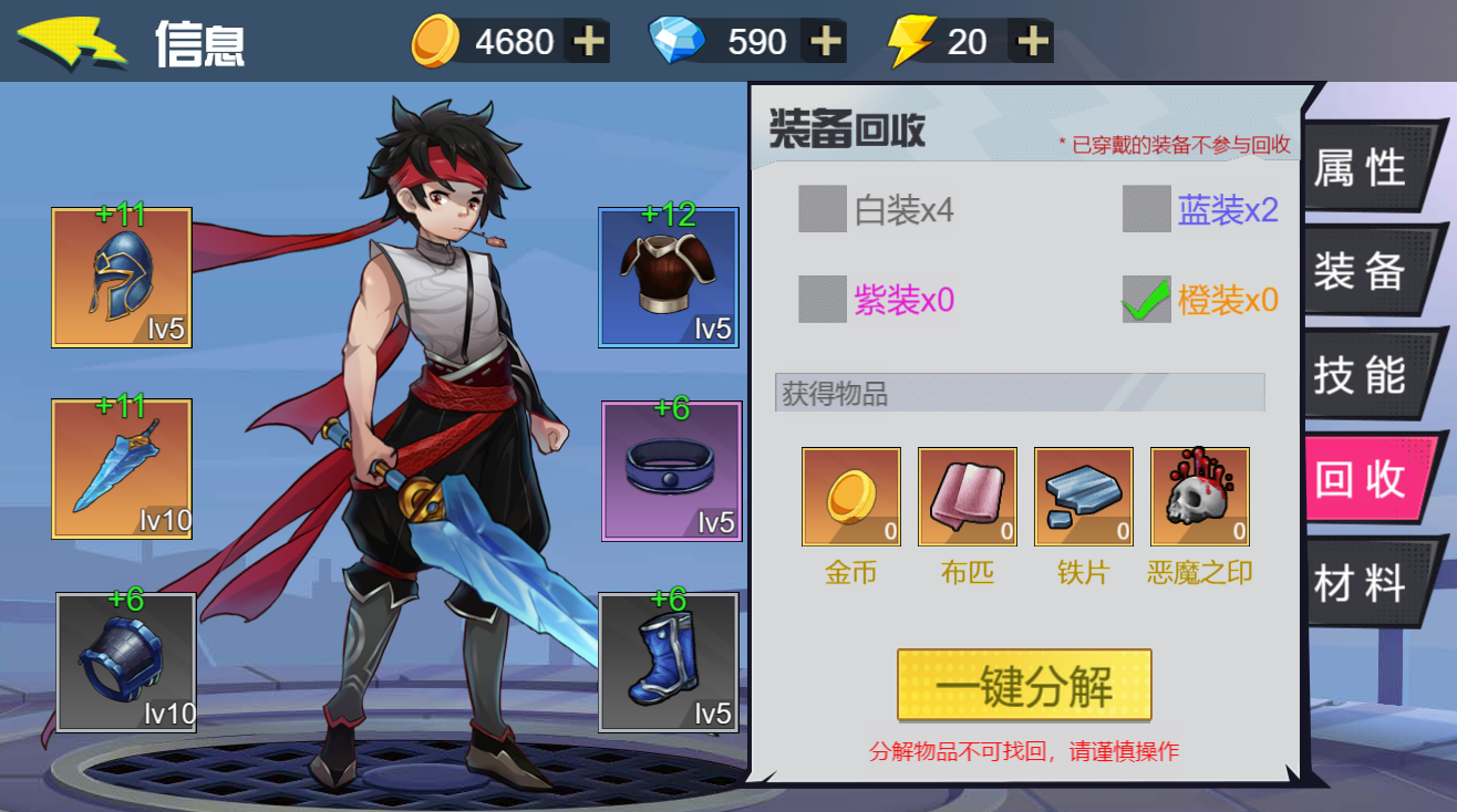 “回收”可以把自己不用的装备等换成金币, 布匹,贴片等原材料用来修炼技能和升级装备。如图2-10: