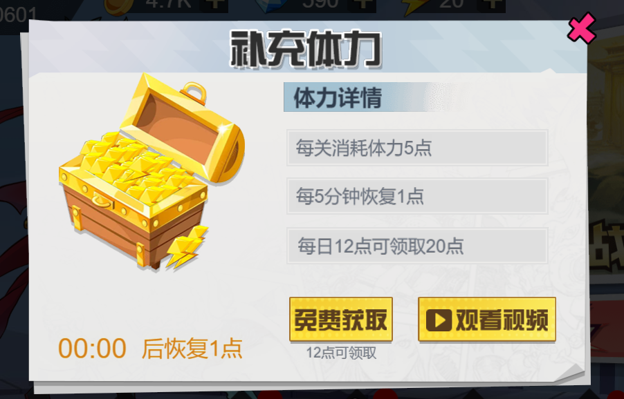 “补充体力”: 游戏中消耗体力,可以通过领取体力与观看视频来获得体力,如图2-12所示