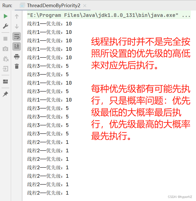 多个线程设置了不同的优先级,同时启动这多个线程,并不是优先级最高的一定先执行完之后再执行优先级最低的线程,而是高优先级获取到CPU时间片的概率更多,整个执行大致符合高优先级的线程最先执行完。