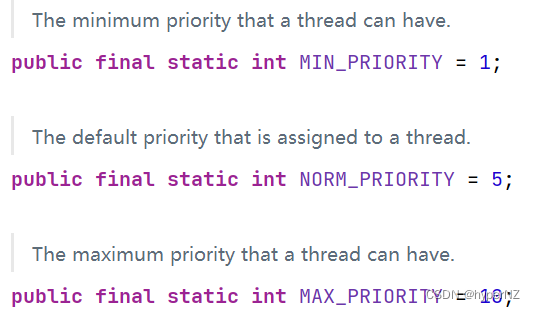 // t1.setPriority(10); //直接赋值t1.setPriority(Thread.MAX_PRIORITY); //枚举Thread t2 = new Thread(new Runnable() {@Overridepublic void run() {Thread t = Thread.currentThread();int priority = t.getPriority();for (int i = 0; i < MAX_COUNT; i++) {System.out.println(t.getName() + "——优先级:" + priority);}}},"线程2");t2.setPriority(Thread.MIN_PRIORITY);Thread t3 = new Thread(new Runnable() {@Overridepublic void run() {Thread t = Thread.currentThread();int priority = t.getPriority();for (int i = 0; i < MAX_COUNT; i++) {System.out.println(t.getName() + "——优先级:" + priority);}}},"线程3");t3.setPriority(Thread.NORM_PRIORITY);//同时启动线程(非常快,可以认为是同时的)t2.start();t1.start();t3.start();}