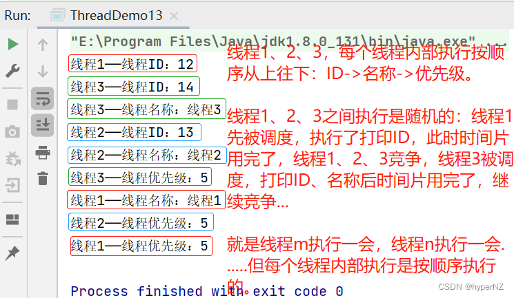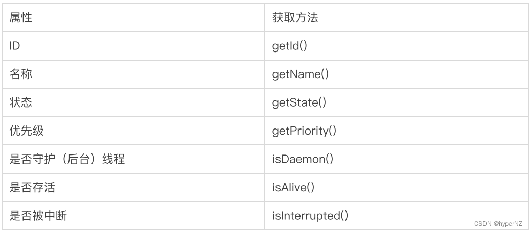 public class ThreadDemo13 {public static void main(String[] args) throws InterruptedException {Runnable runnable = new Runnable() {@Overridepublic void run() {//得到执行当前任务的线程Thread t = Thread.currentThread();//打印线程id(是long类型)System.out.println(t.getName() + "——线程ID:" + t.getId());//①//打印线程名称System.out.println(t.getName() + "——线程名称:" + t.getName());//②//打印线程优先级System.out.println(t.getName() + "——线程优先级:" + t.getPriority());//③}};Thread thread = new Thread(runnable,"线程1");thread.start();Thread thread2 = new Thread(runnable,"线程2");thread2.start();Thread thread3 = new Thread(runnable,"线程3");thread3.start();} }
