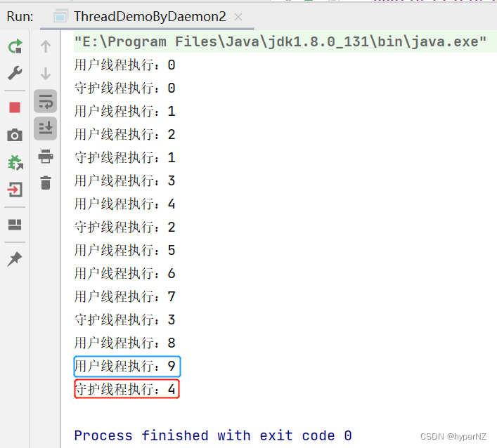 public class ThreadDemoByDaemon2 {public static void main(String[] args) throws InterruptedException {userThread();daemonThread();}/*** 用户线程*/private static void userThread() {Thread thread = new Thread(() -> {for (int i = 0; i < 10; i++) {System.out.println("用户线程执行:" + i);try {Thread.sleep(200);} catch (InterruptedException e) {e.printStackTrace();}}});thread.start();}/*** 守护线程*/private static void daemonThread() {Thread t = new Thread(() -> {for (int i = 0; i < 10; i++) {System.out.println("守护线程执行:" + i);try {Thread.sleep(500);} catch (InterruptedException e) {e.printStackTrace();}}});//设置为守护线程t.setDaemon(true);//启动线程t.start();}