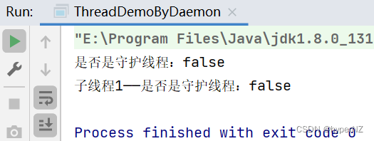 public class ThreadDemoByDaemon {public static void main(String[] args) {//得到当前的线程(main主线程)Thread thread = Thread.currentThread();System.out.println("是否是守护线程:" + thread.isDaemon());Thread t1 = new Thread(() -> {//得到当前线程Thread cThread = Thread.currentThread();System.out.println(cThread.getName() + "——是否是守护线程:" + thread.isDaemon());},"子线程1");t1.start(); //启动线程}