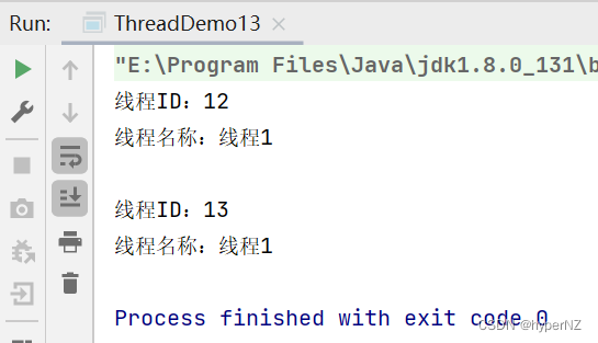 public class ThreadDemo13 {public static void main(String[] args) throws InterruptedException {Runnable runnable = new Runnable() {@Overridepublic void run() {//得到执行当前任务的线程Thread t = Thread.currentThread();//打印线程id(是long类型)System.out.println("线程ID:" + t.getId());//打印线程名称System.out.println("线程名称:" + t.getName());}};Thread thread = new Thread(runnable,"线程1");thread.start();Thread.sleep(500);System.out.println();Thread thread2 = new Thread(runnable,"线程1");thread2.start();}