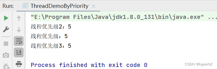public class ThreadDemoByPriority {public static void main(String[] args) throws InterruptedException {Thread thread = new Thread(new Runnable() {@Overridepublic void run() {//得到当前线程,并打印线程优先级Thread t = Thread.currentThread();System.out.println("线程优先级:" + t.getPriority());}});System.out.println("线程优先级2:" + thread.getPriority());thread.start();Thread.sleep(500);System.out.println("线程优先级3:" + thread.getPriority());}