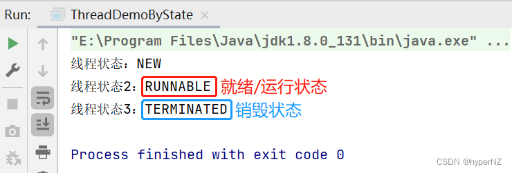 public class ThreadDemoByState {public static void main(String[] args) throws InterruptedException {Thread t = new Thread(new Runnable() {@Overridepublic void run() {//拿到当前线程,并打印当前线程的状态Thread thread = Thread.currentThread();System.out.println("线程状态2:" + thread.getState());}});//打印线程的状态System.out.println("线程状态:" + t.getState());t.start();//再次打印线程状态Thread.sleep(500);System.out.println("线程状态3:" + t.getState());}