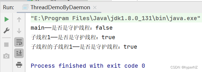 public class ThreadDemoByDaemon {public static void main(String[] args) throws InterruptedException {//得到当前的线程(main主线程)Thread thread = Thread.currentThread();System.out.println(thread.getName() + "——是否是守护线程:" + thread.isDaemon());Thread t1 = new Thread(() -> {//得到当前线程Thread cThread = Thread.currentThread();System.out.println(cThread.getName() + "——是否是守护线程:" + cThread.isDaemon());//创建子线程Thread tt1 = new Thread(() -> {Thread cThread2 = Thread.currentThread();System.out.println(cThread2.getName() + "——是否是守护线程:" + cThread2.isDaemon());},"子线程的子线程1");tt1.start();},"子线程1");//手动指定线程为守护线程t1.setDaemon(true);t1.start(); //启动线程//主线程休眠1sThread.sleep(1000);}