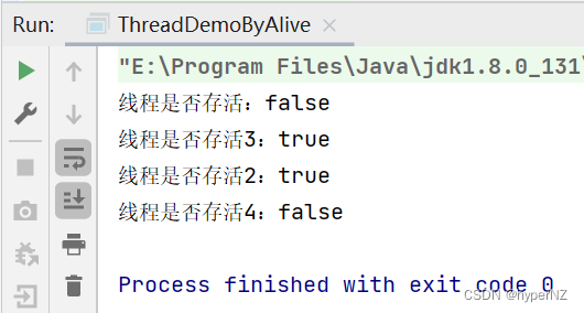 public class ThreadDemoByAlive {public static void main(String[] args) throws InterruptedException {Thread t = new Thread(() -> {Thread thread = Thread.currentThread();System.out.println("线程是否存活2:" + thread.isAlive());});System.out.println("线程是否存活:" + t.isAlive());t.start();System.out.println("线程是否存活3:" + t.isAlive());Thread.sleep(1000);System.out.println("线程是否存活4:" + t.isAlive());}
