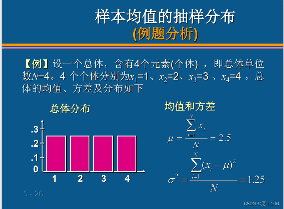 设从均值为μ\muμ,方差为σ2\sigma^2σ2的一个任意总 体中抽取容量为n的样本,当n充分大时,样本均值的抽样分布近似服从均值为μ\muμ、方差为σ2/n\sigma^2/nσ2/n的正态分布