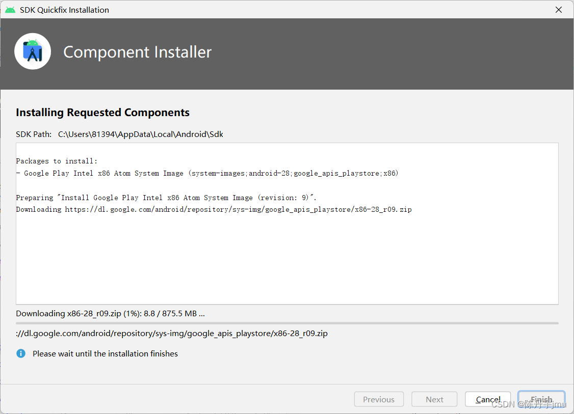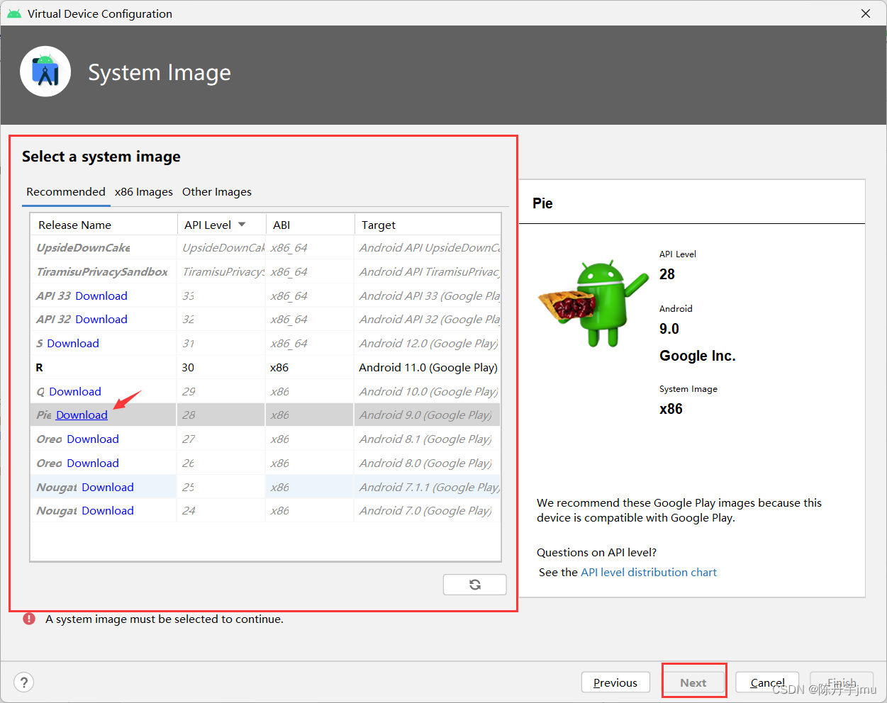 选择需要给Android Device安装的Android 版本,根据自身电脑设备的存储容量决定需要下载哪个设备哈,初学者选择API 28(Android 9)的版本练手就可以满足啦。