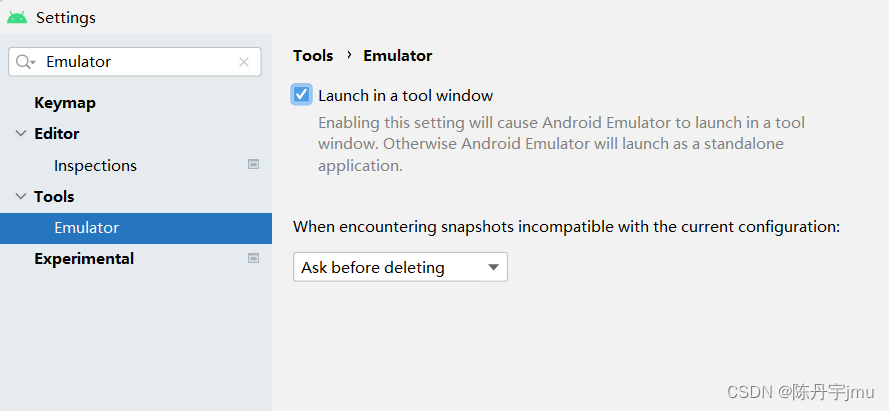 在 File >> Setting 中搜索 Emulator ,将 Launch in a tool windows的勾去掉,然后重启Android Studio,在尝试打开AVD设备,可以发现,AVD的显示是以一个独立的窗口呈现的。
