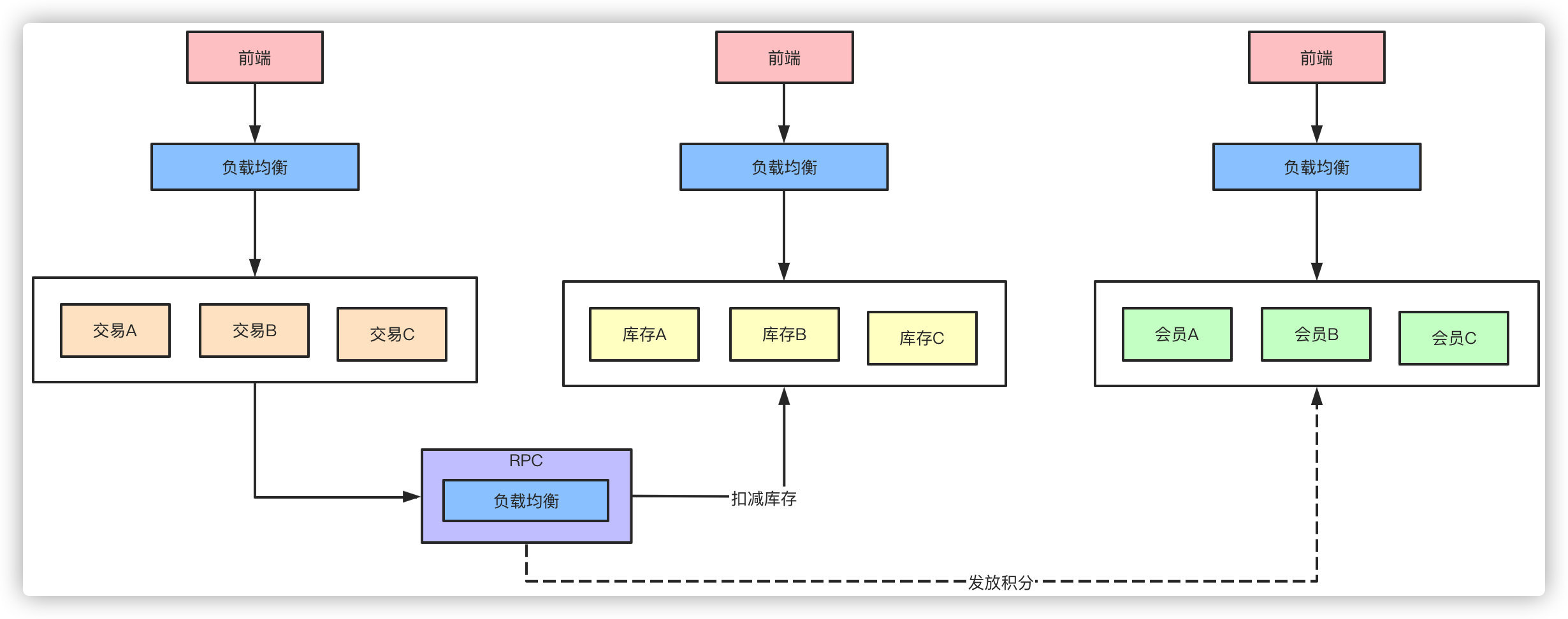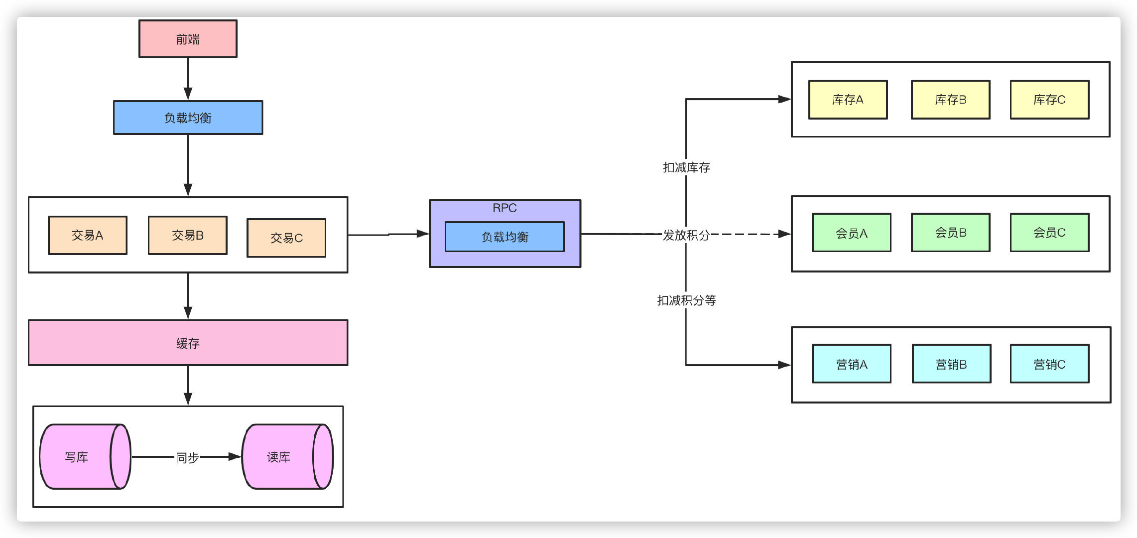 对于一些不需要同步执行的接口,可以通过引入消息队列的方式异步执行以提高接口响应时间。在交易完成之后需要扣库存,然后可能需要给会员发放积分,本质上,发积分的动作应该属于履约服务,对实时性的要求也不高,我们只要保证最终一致性也就是能履约成功就行了。