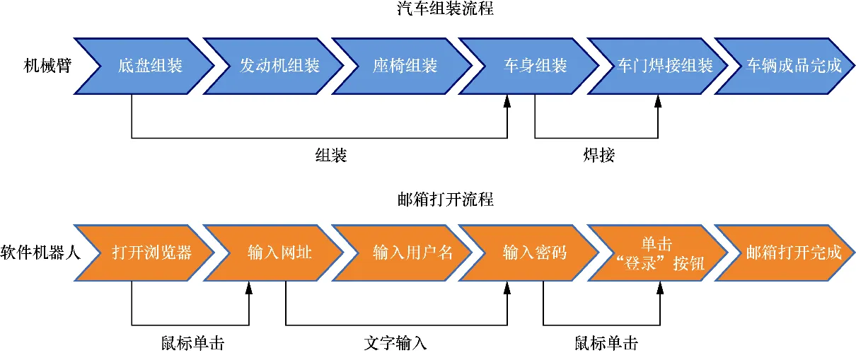 图1-1 汽车组装流水线上的机械臂和软件机器人对比