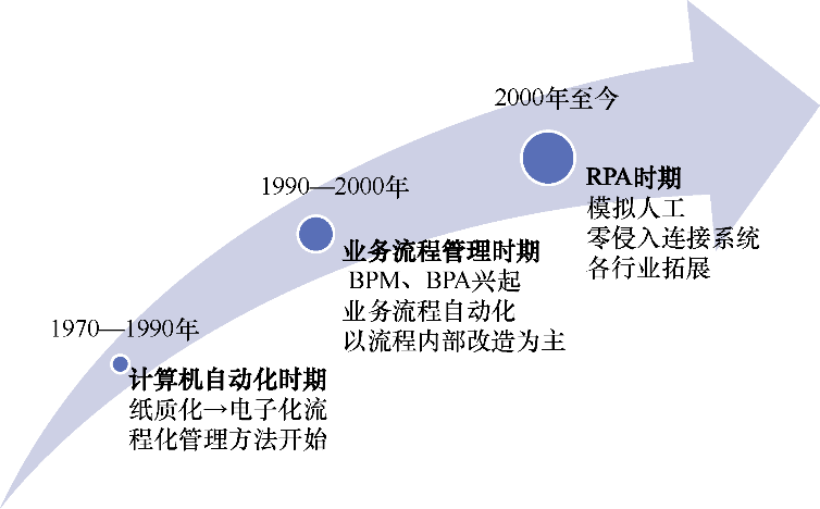 RPA作为近几年来国内外热门的一个技术领域,其发展历程并不短(只是国内RPA兴起时间较短,从2016年左右开始),大致可以分为如图1-2所示的3个阶段。