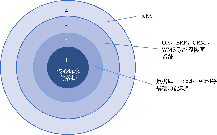 使用RPA软件,用户不需对现有系统进行升级改造,因为RPA的显著特点就是通过非侵入的方式模拟人工操作。与传统的IT系统(如ERP、OA、CRM等)不同,RPA运行在更高的软件层级,如图1-3所示。这就决定了它不会侵入或影响已有的软件系统,从而在保证企业已有的IT系统功能可以平稳、可靠地运行的同时,帮助企业提升效能。