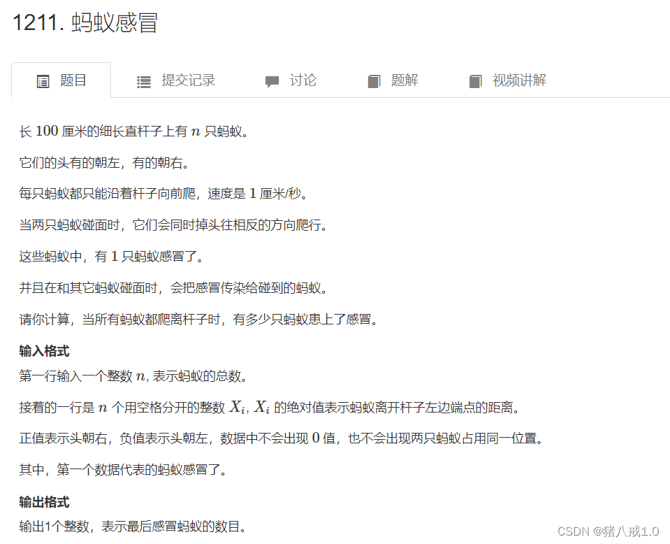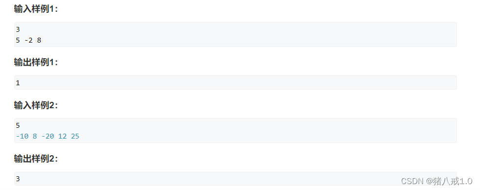 import java.util.Scanner;public class Main {static int a[] = new int[105];static int target, res=1;public static void main(String[] args) {Scanner sc = new Scanner(System.in);int N=sc.nextInt();for(int i=1;i<=N;i++) {int num=sc.nextInt();//记录第一只感冒蚂蚁if(i==1) target=num;//蚂蚁向右if(num>0) a[num]=1;//蚂蚁向左else a[-num]=-1;}//如果第一只感冒蚂蚁向右if(target>0) {int j=target+1;//用来计数右边有多少个向左的,只要有一个就行int m=0;//右边情况for(;j0) {if(m>0) {res++;}}}}//如果第一只感冒蚂蚁向左else {int j=(-target)+1;//用来计数左边有多少个向右的,只要有一个就行int m=0;//左边情况for(int k=0;k0) {res++;m++;}}//右边情况for(;j0) {res++;}}}}System.out.println(res);}