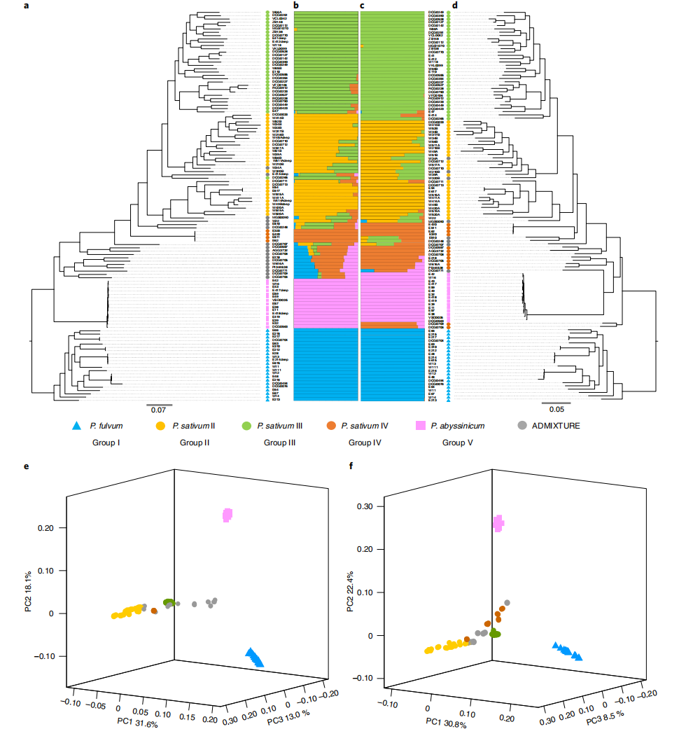 基于SNP和SV数据集构建的系统发育树(图3a,d)结果显示,主要分支的系统发育关系相似,与ADMIXTURE结果的主要遗传类群具有良好的对应关系。此外,P. fulvum、P. abyssinicum和P. sativum形成了三个独立的分支(图3a,d),这在对SNP和SV数据集的主成分分析中得到了支持(图3e,f)。