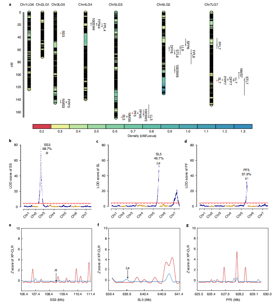 为探索豌豆重要农艺性状的遗传基础,对300个F2群体(WJ×ZW6)的12个农艺性状进行了QTL分析,构建了7个跨度924.1 cM的高密度(0.31 cM)遗传连锁图谱。有25个QTL与12种农艺性状相关,其最高的表型变异解释度高达68.7%(图4a)。在同源性比对和功能注释的结果发现了两个先前已知的孟德尔性状的遗传位点,R(粒型)和Le(株高),以及一个可能与荚形相关的候选基因(Psat05G0794700)。然而,这些基因都没有落在假定的选择区域,这意味着它们可能与豌豆驯化没有密切相关(图4e-g)。