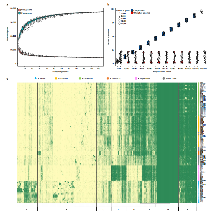 图5 基于116个有代表性的栽培豌豆和野生豌豆的泛基因组分析。