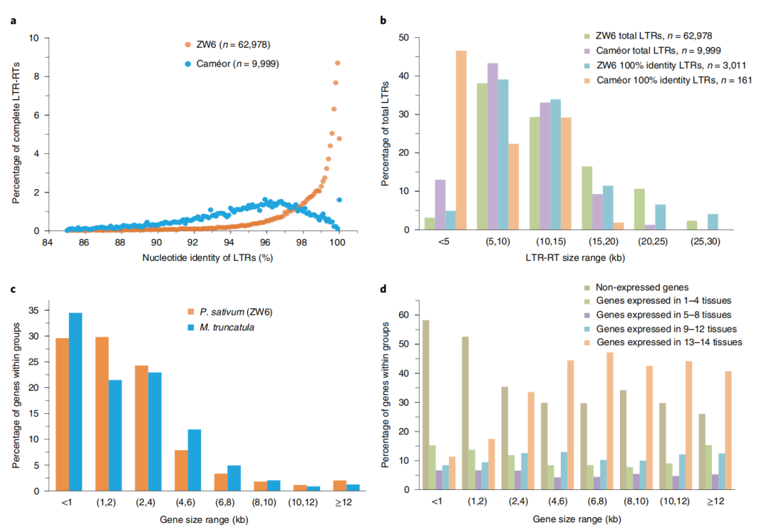 PeaZW6共鉴定出47,526个编码基因。PeaZW6中蛋白质编码基因的长度分布与苜蓿属相当,而苜蓿属的基因组大小只有豌豆的八分之一(图2c)。此外,长度超过2 kb的基因具有相似的表达宽度模式(图2d)。这些结果表明,豌豆基因组中的高重复序列含量可能对基因结构或蛋白质编码基因的表达谱影响不大。