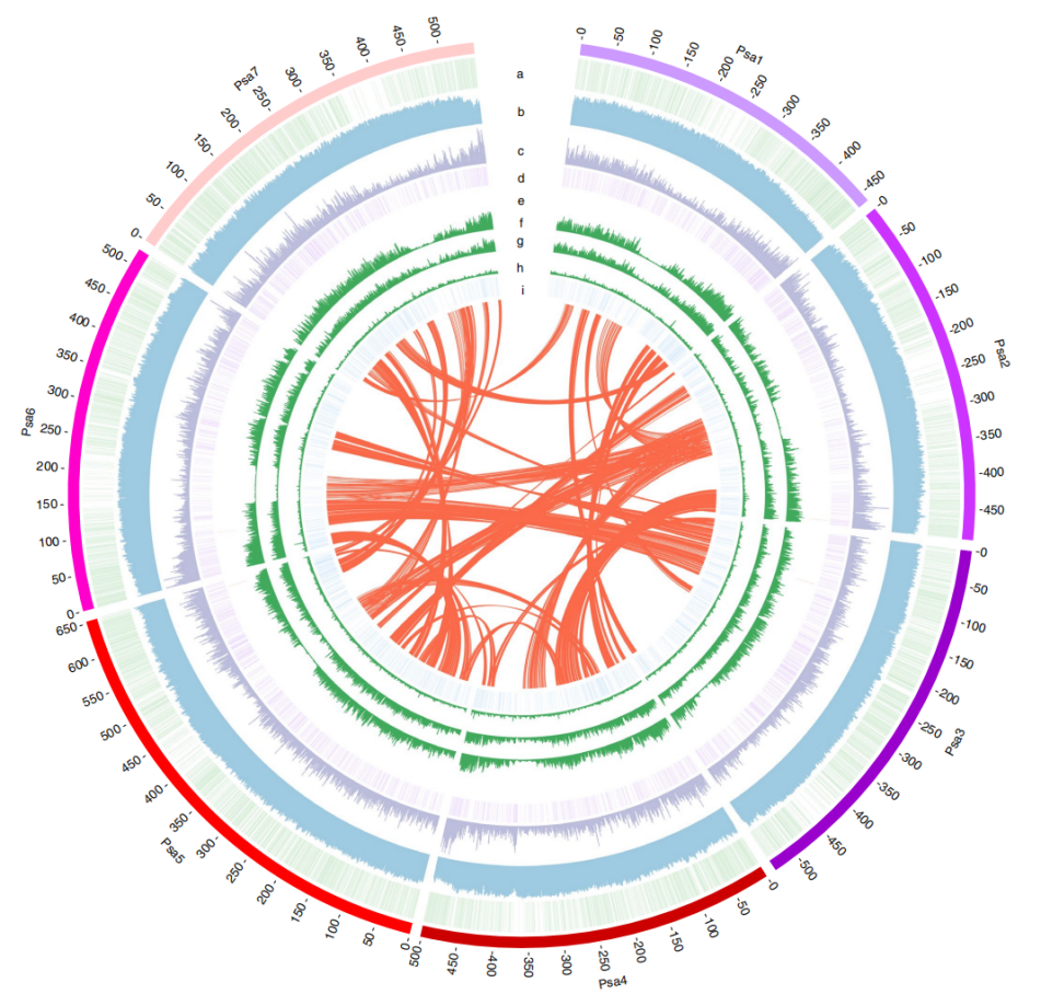 研究基于PacBio单分子实时(SMRT)测序、10×基因组测序、染色体构象捕获(Hi-C)测序以及NGS技术,对豌豆品种ZW6基因组进行了de novo组装。随后对116份豌豆材料进行了泛基因组的研究。