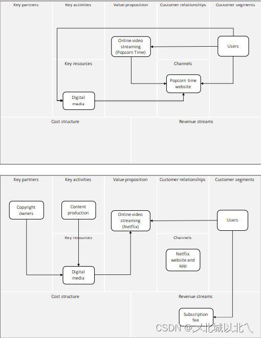 Popcorn Time 和 Netflix是两个具有相似价值主张的数字服务。利用BMC商业模型画布 和 SRM利益相关者模型为Popcorn Time 和 Netflix设计商业模式。由此产生的商业模式有哪些主要区别? Popcorn Time 和 Netflix的主要技术区别是什么?Popcorn Time和Netflix都是在线流媒体的提供商(例如视频、系列、,和电影)。