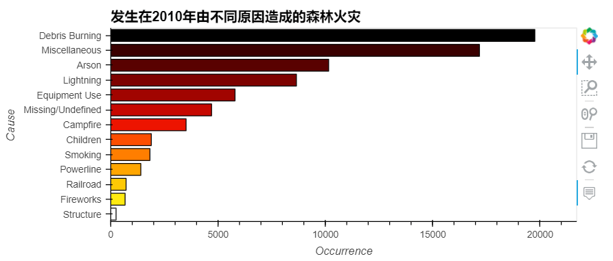 def plot_cause_occur(year): year_df = df[df['FIRE_YEAR'] == year].copy() caused_df = pd.DataFrame(year_df.groupby('STAT_CAUSE_DESCR').size(), columns=['Count']).sort_values('Count') caused_df['Cause'] = caused_df.index return caused_df.hvplot.barh(x='Cause', y='Count', c='Cause', cmap='fire_r', legend=False).opts(ylabel="Occurrence", title="发生在{}年由不同原因造成的森林火灾".format(year))