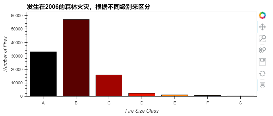 def plot_class(year): year_df = df[df['FIRE_YEAR'] == year].copy() count_df = pd.DataFrame(year_df.groupby('FIRE_SIZE_CLASS').size(), columns=['Count']) count_df['Fire Class'] = count_df.index return count_df.hvplot.bar(x='Fire Class', y='Count', c='Fire Class', cmap='fire', legend=False).opts(xlabel="Fire Size Class", ylabel="Number of Fires", title="发生在{}的森林火灾,根据不同级别来区分".format(year))