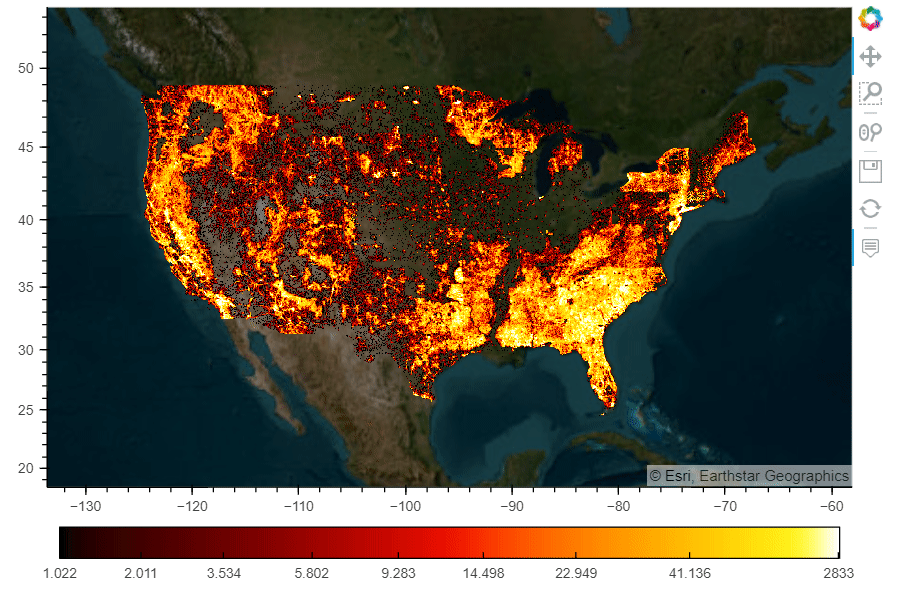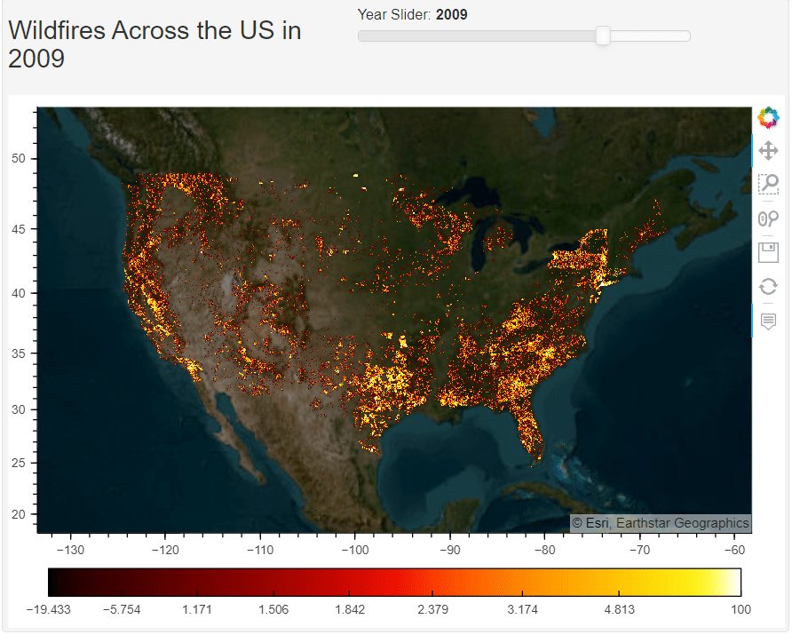 def plot_map(year_1): year_df = df[df['FIRE_YEAR'] == year_1].copy() plot = year_df.hvplot( 'LONGITUDE', 'LATITUDE', geo=True, kind='points', rasterize=True, cmap=cc.fire, cnorm='eq_hist', colorbar=True).opts(colorbar_position='bottom', xlabel='', ylabel='') return map_tiles * plot