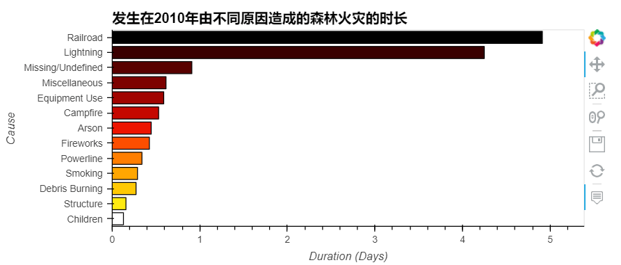 def plot_cause_duration(year): year_df = df[df['FIRE_YEAR'] == year].copy() caused_df = pd.DataFrame(year_df.groupby('STAT_CAUSE_DESCR')[['BURN_TIME']].mean().sort_values('BURN_TIME')) caused_df['Cause'] = caused_df.index return caused_df.hvplot.barh(x='Cause', y='BURN_TIME', c='Cause', cmap='fire_r', legend=False).opts( ylabel="Duration (Days)", title="发生在{}年由不同原因造成的森林火灾".format(year))
