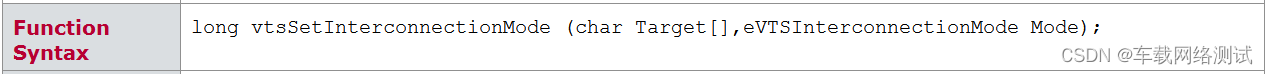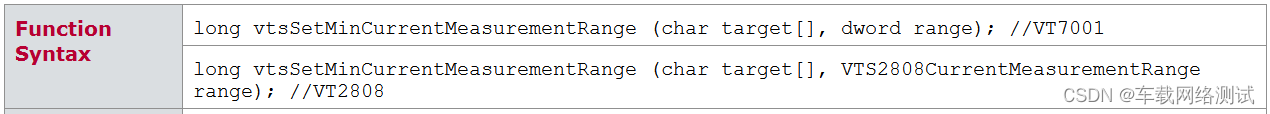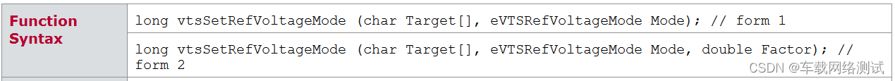 {// 将模式设置为仅一个电源->内部电源vtsSetInterconnectionMode("VTS::PowerSupply", eVTSInterconnectionModeSupInt);// 设置电压 12.0 VvtsSetRefVoltageMode("VTS::IntSupply", 1);@sysvar::VTS::IntSupply::RefVoltage = 12.0;// 打开两个输出@sysvar::VTS::Clamp30::Active = eVTSOutputModeActive;@sysvar::VTS::Clamp15::Active = eVTSOutputModeActive;//通过卡箍15测量ECU消耗的电流//2秒后(结果写入写入窗口)TestWaitForTimeOut(2000);write("ECU is consuming %fmA.", @sysvar::VTS::Clamp30::AvgCurrent);