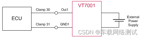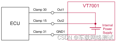 内部电源单元提供电力,并且ECU连接到OUT1(KL30)、OUT2(KL15)和GND1(KL31)。在本例中,内部电源单元的通道名为“IntSupply”,两个输出通道名为为“Clamp30”和“Clamp15”,VT7001模块名为“PowerSupply”。