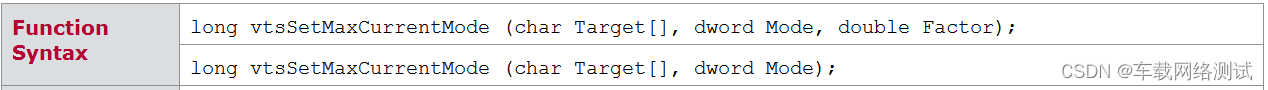 {// 将模式设置为仅一个电源->外部电源1vtsSetInterconnectionMode("VTS::PowerSupply", 1);// 用定值模式激活最大电流模式// 系数为0.5vtsSetMaxCurrentMode("VTS::ExtSupply", 1, 0.5);// 将电源设置为最大10A@sysvar::VTS::ExtSupply::MaxCurrent = 10.0;// 打开开关输出@sysvar::VTS::Clamp30::Active = 1;