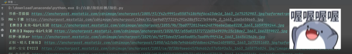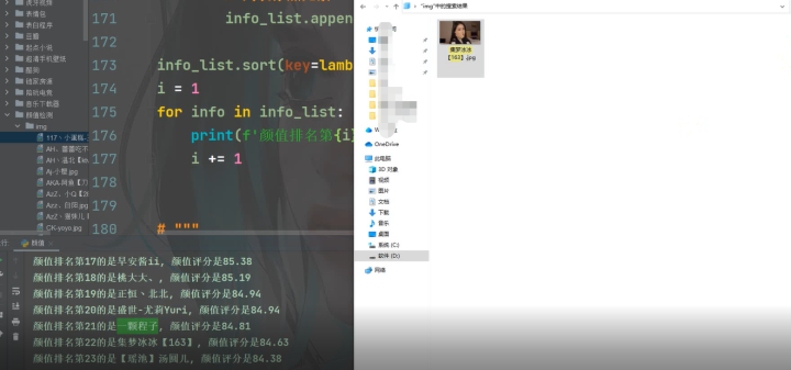 for file in tqdm(files):# 延时请求慢点time.sleep(0.5)# 完整的路径filename = 'img\\' + file# 切片name = file[:-4]result = score(file=filename)if result != '识别失败':dit = {'主播': name,'颜值': result}# 列表添加元素info_list.append(dit)info_list.sort(key=lambda x:x['颜值'], reverse=True)