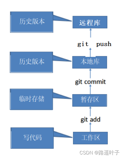 首先是我们的工作区,是开发者进行代码编写,存放代码的地方。当我们的代码编写完成之后呢我们就使用命令git add 将代码添加到暂存区,进行临时存储;然后git commit 将暂存区的代码提交到我们的本地库,到了本地库之后就会生成对应的历史版本,这个历史版本是无法进行删除的。然后将本地库的代码git push推送到远程库中。其实这里我们还可以通过git pull 将远程库的代码进行拉取下来到我们的本地库,也就是对整个远程库项目的一个克隆备份,然后在进行修改,然后在添加、提交、推送循环往复,可多人进行项目开发。