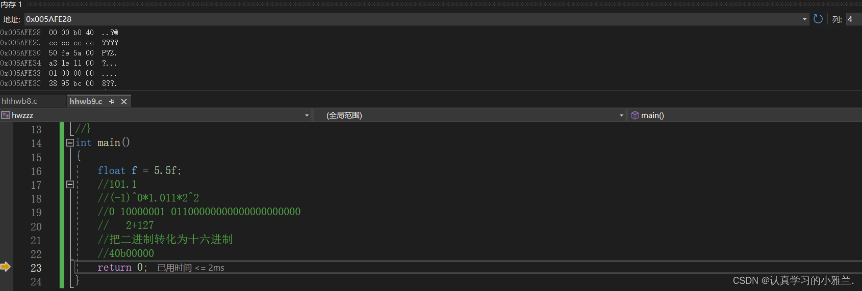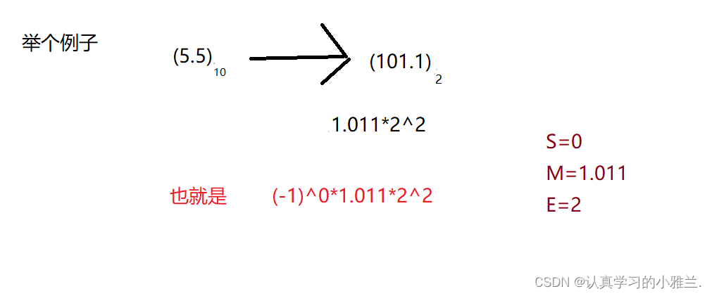 {float f = 5.5f;//101.1//(-1)^0*1.011*2^2//0 10000001 01100000000000000000000// 2+127//把二进制转化为十六进制//40b00000return 0;