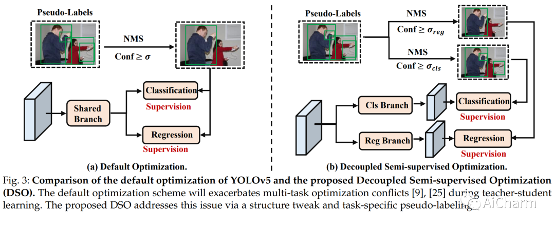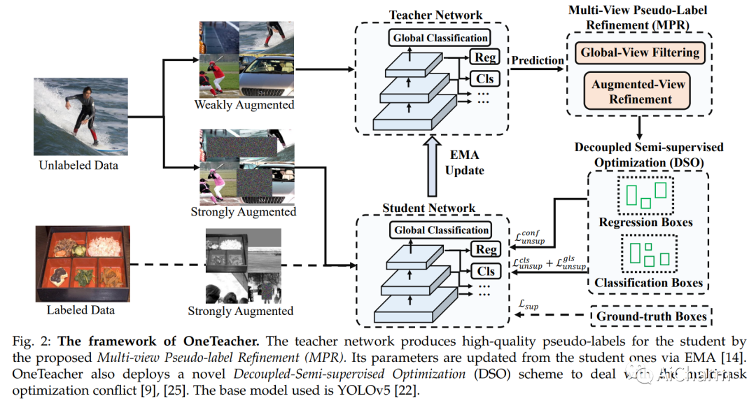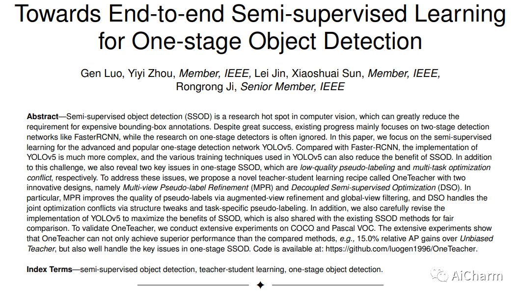 半监督对象检测(SSOD)是计算机视觉领域的研究热点,它可以大大减少对昂贵的边界框标注的需求。尽管取得了巨大的成功,但现有的进展主要集中在像 FasterRCNN 这样的两级检测网络上,而对一级检测器的研究往往被忽视。在本文中,我们专注于先进和流行的单阶段检测网络 YOLOv5 的半监督学习。与 Faster-RCNN 相比,YOLOv5 的实现要复杂得多,YOLOv5 中使用的各种训练技术也可以降低 SSOD 的好处。除了这一挑战,我们还揭示了单阶段 SSOD 中的两个关键问题,分别是低质量伪标记和多任务优化冲突。为了解决这些问题,我们提出了一种名为 OneTeacher 的新型师生学习方法,它具有两种创新设计,即多视图伪标签优化 (MPR) 和解耦半监督优化 (DSO)。特别是,MPR 通过增强视图细化和全局视图过滤提高了伪标签的质量,而 DSO 通过结构调整和特定于任务的伪标签来处理联合优化冲突。此外,我们还仔细修改了 YOLOv5 的实现,以最大限度地发挥 SSOD 的优势,这也与现有的 SSOD 方法共享,以进行公平比较。为了验证 OneTeacher,我们对 COCO 和 Pascal VOC 进行了大量实验。广泛的实验表明,OneTeacher 不仅可以实现优于比较方法的性能,例如,相对于 Unbiased Teacher 提高 15.0% 的相对 AP,而且可以很好地处理单阶段 SSOD 中的关键问题。